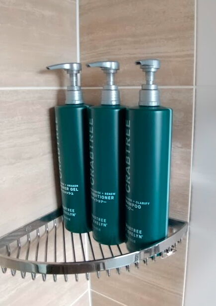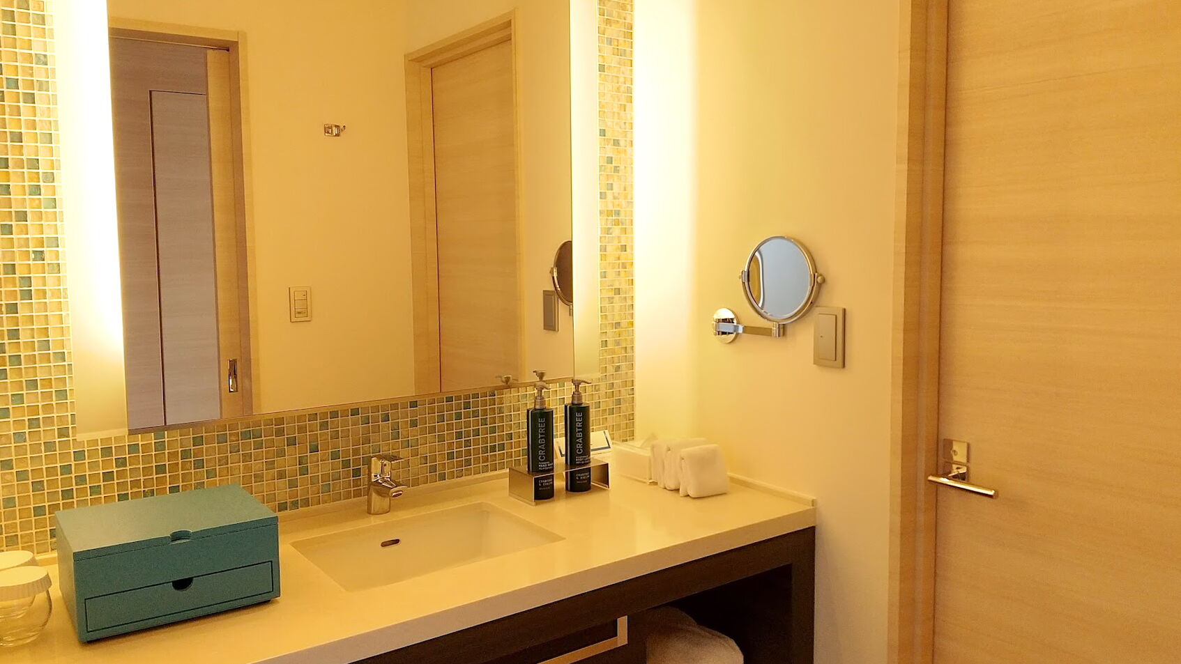 バスルームの照明つけず、ブラインドごしに入るアメリカンビレッジの灯りだけでバスタブに浸かるのもいいですよ。